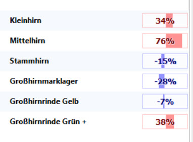 Nach der automatischen Analyse können Sie über die unten platzierten Schieber die Anzahl nach % Relevanzen ändern. Die Anzahl der ermittelten Gehirnzonen an der linken Seite bitte nicht reduzieren auch wenn die % Zahlen klein sein sollten.